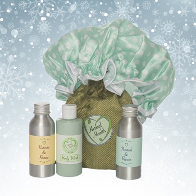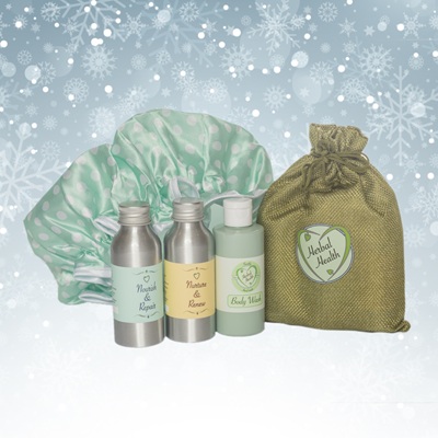 Perfect for gifting or for holidays this hemp bag is stuffed with 100ml bottles of Nourish & Repair, Nurture and Renew and our new Soothe body wash. There’s also a fabulous, frilly shower cap.