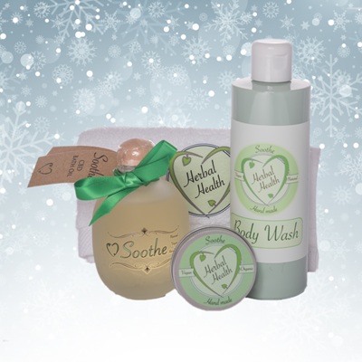 The perfect gift for sensitive skin a Soothe bath oil, Soothe body wash (250ml) and a 30ml supercharged Soothe balm with a gorgeous 100% cotton embossed flannel.